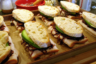 Preheat oven to 375 degrees while the sandwiches are assembled on two baking sheets. Place eight ciabatta slices on each sheet. I crammed them all onto one sheet here, but it works out better if you use two. Place 1/4 pound of turkey on every other slice (we'll call these the bottoms). Hopefully, your turkey is sliced thinner than mine is here; it just tastes better when it's thin and elegantly piled. Onto the turkey, layer the now completely caramelized onions.